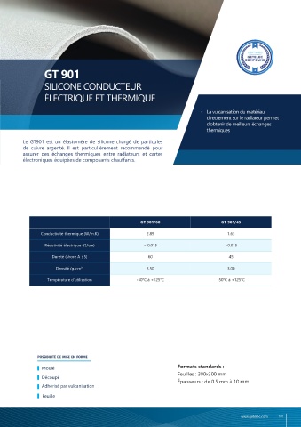 Nos GT906 et GT907 sont composés d’un élastomère de silicone comprise entre -50°C et +220°C Le GT901 est un élastomère de silicone chargé de particules
