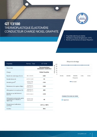 Densité (g/cm 3) ASTM D 762 1.75 10 GHz 90 dB Dureté (shore A) ASTM D 2240 55 0 20 MHz 100 MHz 500 MHz 2 GHz1 0 GHz