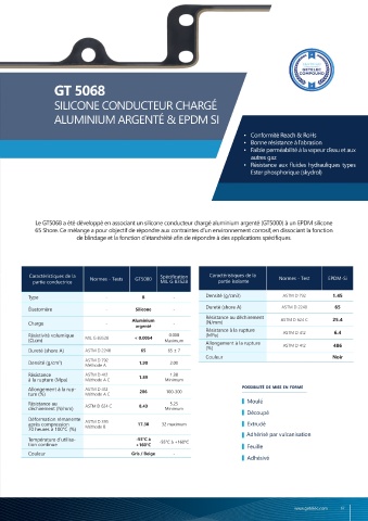 FICHE TECHNIQUE Le GT5068 a été développé en associant un silicone conducteur chargé aluminium argenté (GT5000) à un EPDM silicone