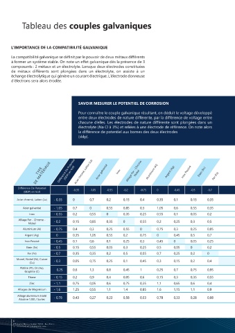 DE MATÉRIAUX Différence De Potentiel Acier chromé, Laiton (La) Acier galvanisé Inox Alliage Fer - Chrome Aluminium (Al) Argent (Ag) Inox Passivé Etain (Sn) Fer (Fe) Monel, Nickel (Ni), Platine (Pt), Or (Au), Titane (Ti) Zinc (Zn) Alliages de Magnésium Alliage aluminium traité GT 1000 (Cu / Ag) GT 5000 (Al / Ag) GT 2000 (Ag) BL 10000 (Carbone) GT 3100 (Ni / C)